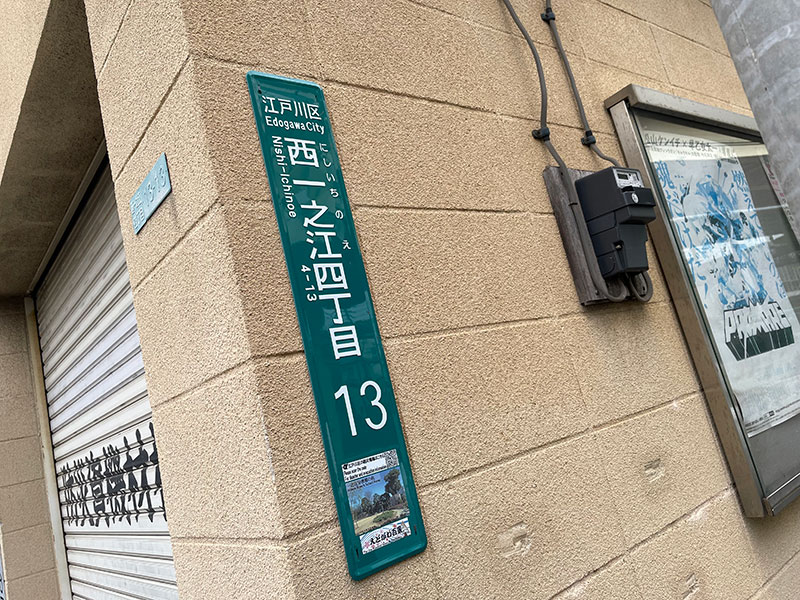 まずは現在緊急停車した場所を確認。不幸中の幸いなのか?緊急停車する為に突っ込んだ歩道の安全地帯の横には住所の看板「江戸川区にし一ノ江4丁目13」との事。