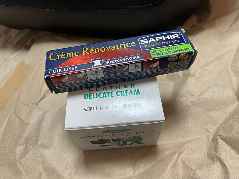 まずは綺麗に水拭きした後、creme renovarice (補修クリーム)で黒く塗り、leather delicate cream(栄養・保革クリーム)を塗布して乾拭き。