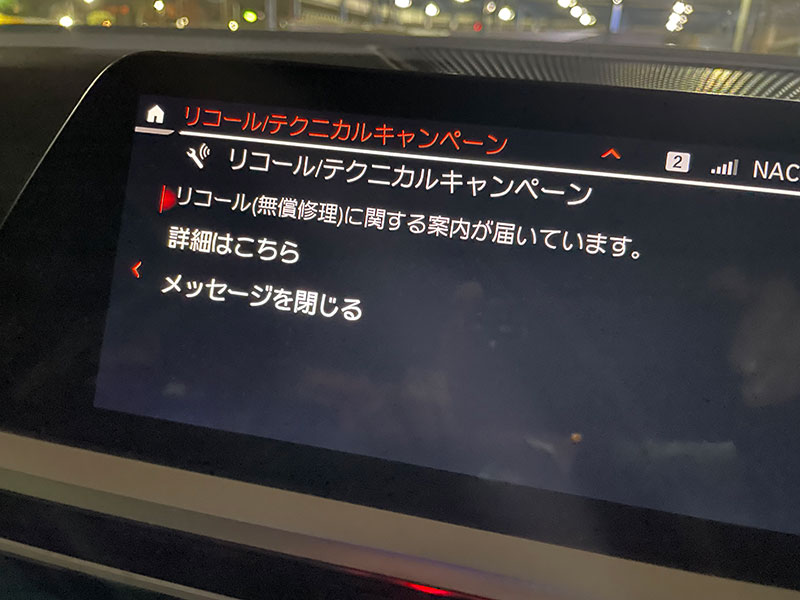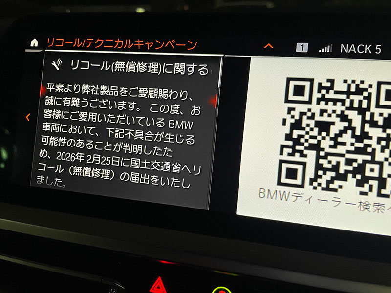 最近の車はリコールの案内も手紙じゃなくて電波に乗って飛んで来るんですね!?(笑)勿論、あとあとBMW正規ディーラーからハガキによる案内があったりするのでしょうが…