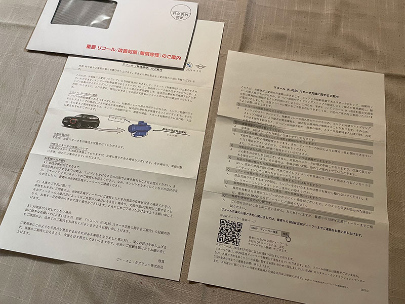 約1ヶ月遅れて BMW JAPAN より手紙にて同様なリコールの案内が届きました。中身は従前同様にエンジンの始動装置であるスターターにおける始動用リレーの耐久不足(外-4155)